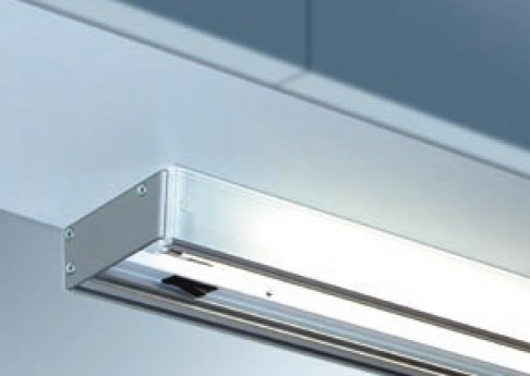 - Может крепиться как в угол между стеной и шкафом, так и вдоль переднего края навесного шкафа (как световой нижний карниз)